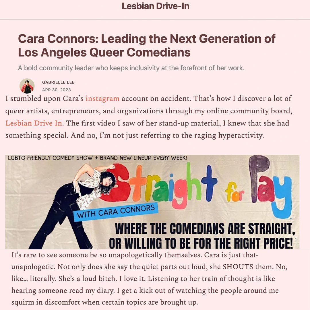 As seen on Just For Laughs, Hulu, Apple TV & more! Cara Connors is an LA-based comedian, actor, writer, and multifaceted homosexual with an ass that won’t quit. Cara stars on Dating #NoFilter on E! and her feminist investigative comedy series, Cara Takes Up Space, is now streaming on OUTtv. Most recently, Cara was invited into The Groundlings Sunday Company, filmed a set for Crooked Media’s Lovett or Leave It, and her debut stand-up album Straight for Pay was named one of Paste Magazine’s Comedy Albums of the Year.